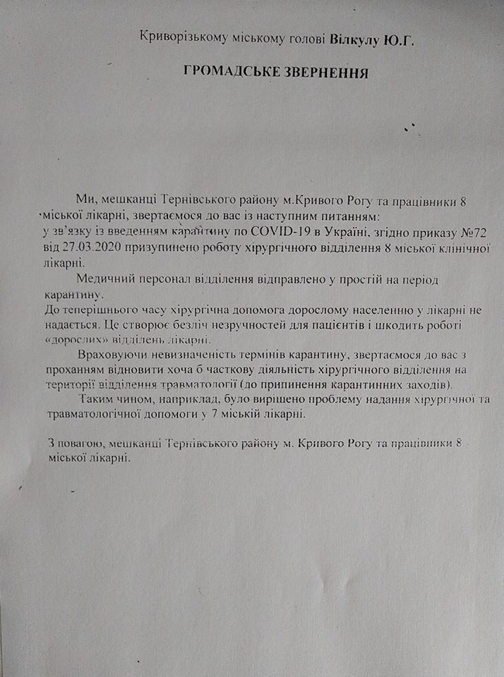 «Мы, жители Терновского района Кривого Рога обращаемся к Вам со следующим вопросом: в связи с введением карантина по covid-19 в Украине, согласно приказу № 72 от 27 03. приостановлена работа хирургического отделения 8 городскую клиническую больницу. Медицинский персонал отделения отправлен в простой на период карантина. К настоящему времени хирургическая помощь взрослому населению в больнице не предоставляется. Это создает огромное количество проблем для пациентов и вредит работе «взрослых» отделений больницы. Учитывая неопределенность сроков карантина обращаемся к Вам с просьбой восстановить хотя бы частичную деятельность хирургического отделения на территории отделения травматологии (до окончания карантинных мероприятий). Таким образом, например, будет решена проблема оказания хирургической и травматологической помощи в 7 горбольнице. С уважением, жители Терновского района Кривого Рога и работники 8 горбольницы », — говорится в обращении.