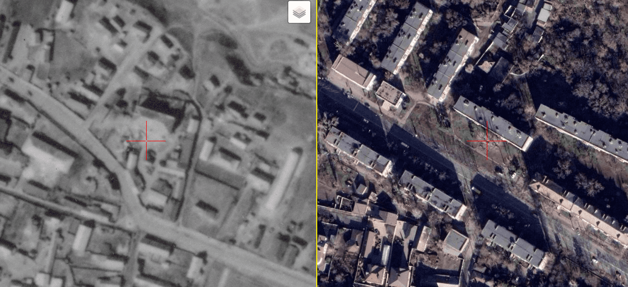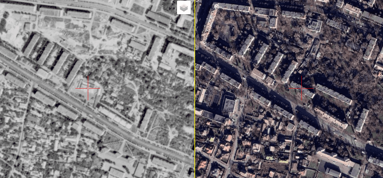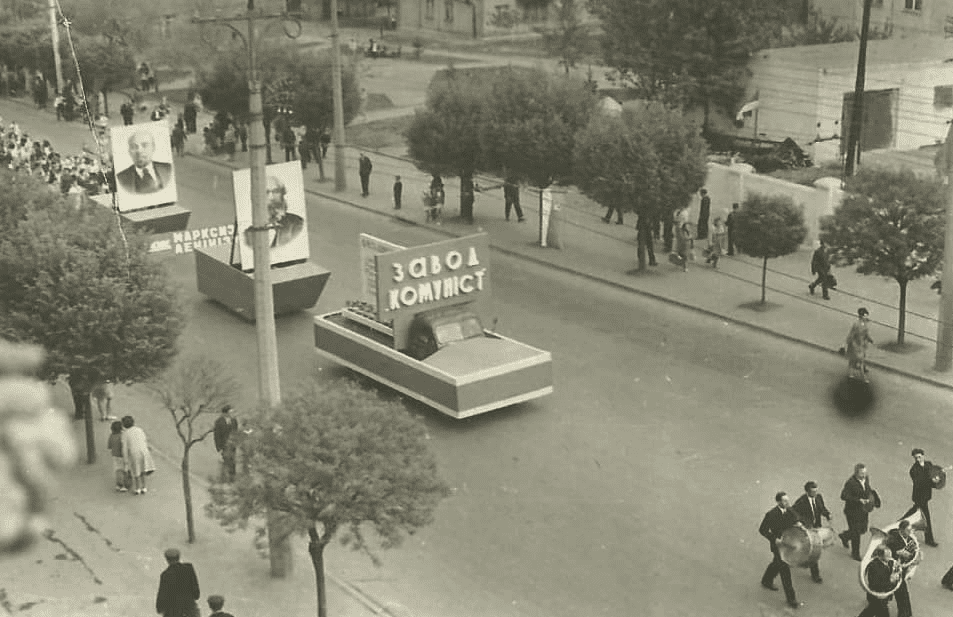 Ліворуч зображено кондитерську фабрику по вулиці Лермонтова в 1941 році, праворуч теж місце в 21 столітті.