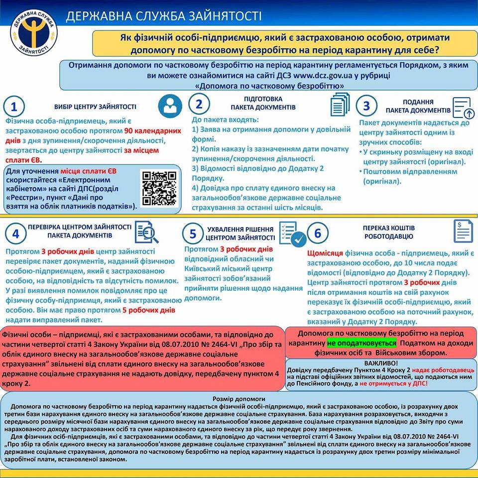 Щоб отримати допомогу від держави, ФОПам необхідно звернутися до центру зайнятості, де вони сплачують єдиний внесок, а також надати необхідний пакет документів для отримання допомоги. Її можна отримати впродовж 3-х місяців з того моменту, коли діяльність була призупинена чи скорочена. Допомога надається на період призупинення/скорочення діяльності та впродовж 30 календарних днів після завершення карантину. Вона нараховується за кожну годину за кожну годину скорочення діяльності та із розрахунку двох третин від бази нарахування єдиного внеску, але не більше мінімальної заробітної плати (4723 грн) на місяць. Військовий збір та податок з допомоги ФОПи не оплачують.